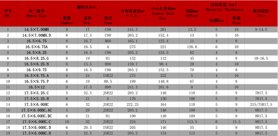 商用车车轮系列参数表格: